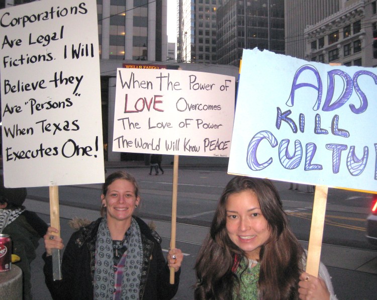 I’m not going to pose and say I was a staunch Occupyer—I was just a visitor. Beckiness and I spent a few days at Occupy San Francisco; we were there for the opening day of Occupy Oakland; after that we went south to Occupy Sacramento. At Occupy SF, we danced on the street and charged our phones in the Financial District’s Starbucks—who hated all of us. We marched; we chanted; we held signs. We demanded that our structures of power grant us our right to exist in autonomy. We slept in a squat house. We learned about civil rights from lawyers and what to do if we got arrested. We watched crowd-led, hierarchy-free governance in action. We demanded those in power change, while we, the masses took power, if over nothing else, ourselves.